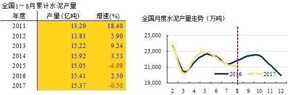 2013年以来,全国水泥产量1~8月度累计产量一直保持在15亿吨以上,2017年产量是2011年以来第三高点,增速是第二低点,今年水泥产量走势基本同步2016年,1~8月累计产量增速较去年同期下降0.50%,8月产量同比下降3.29%。