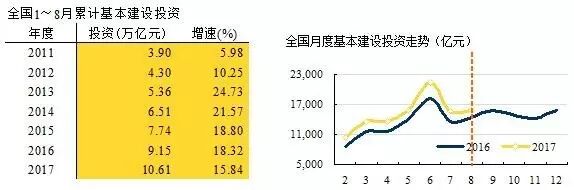 国家统计局发布8月度数据,基本建设继续在高位强劲增长,上1~8月累计投资突破10万亿元,同比增速15.84%,较7月下降近1个百分点。房地产投资继续增长,6.95万亿元,同比增长7.90%。两项投资在投资额、增速上继续保持增长态势。