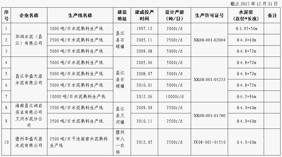 海南工信厅公示:海南水泥熟料生产线清单