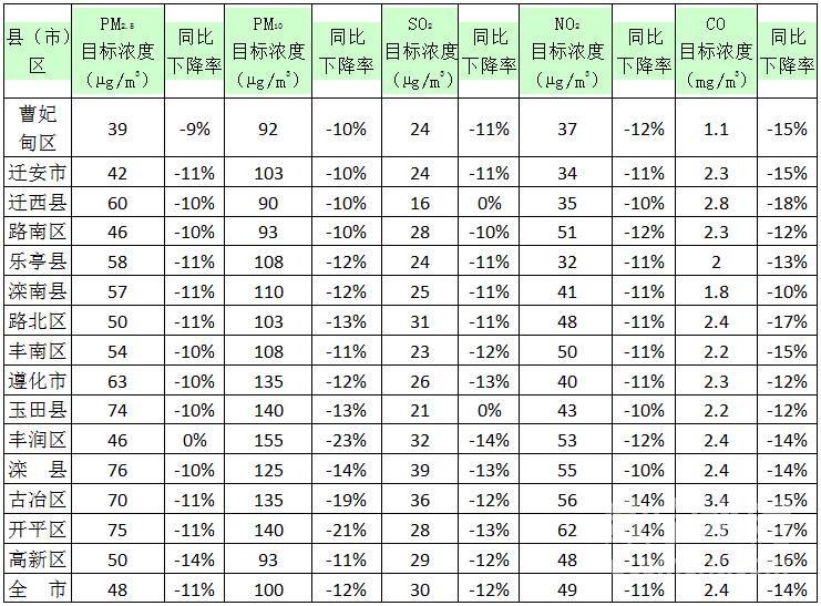 以改善环境质量为核心,坚持目标导向、问题导向、质量导向,突出重点区域、重点行业、重点时段、重点污染源,通过实施“清、治、限、修、绿、禁”6项攻坚行动,以强有力的举措解决生态环保薄弱环节和突出问题,加快完成生态唐山建设各项任务,实现全市环境质量大幅改善。9月份,全市PM2.5、PM10、SO2、NO2、CO平均浓度控制在不超过48微克/立方米(下降11%)、100微克/立方米(下降12%)、30微克/立方米(下降12%)、49微克/立方米(下降11%)、2.4毫克/立方米(下降14%)。