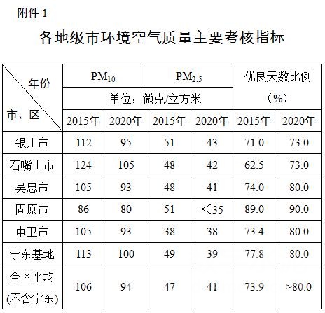 (二)主要目标。到2020年,全区二氧化硫、氮氧化物排放量分别比2015年下降12%;地级城市可吸入颗粒物(PM10)年均浓度较2015年下降11%,细颗粒物(PM2.5)较2015年下降12%,空气质量优良天数比率平均达到80%,重污染天数较2015年减少25%;县级城市PM10年均浓度较2017年下降7.5%,PM2.5较2017年下降2.9%,空气质量优良天数比率平均达到85%,全区空气质量稳步改善。