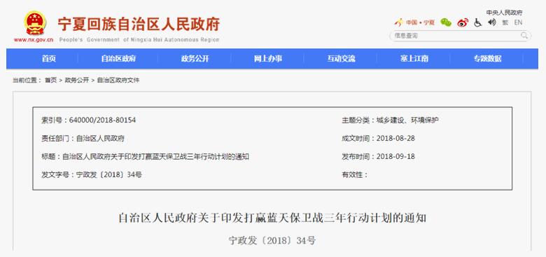 《宁夏回族自治区打赢蓝天保卫战三年行动计划(2018年—2020年)》已经自治区党委和人民政府同意,现印发给你们,请认真贯彻执行。