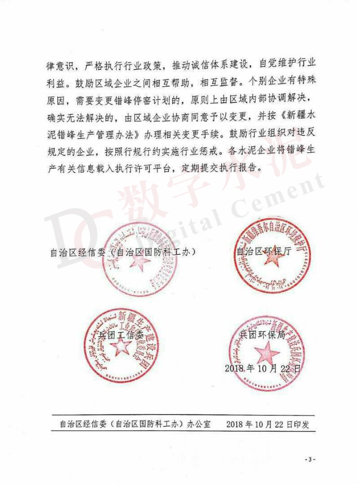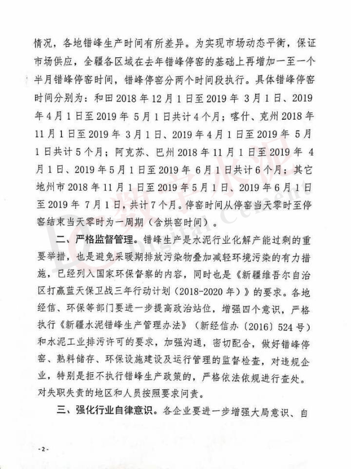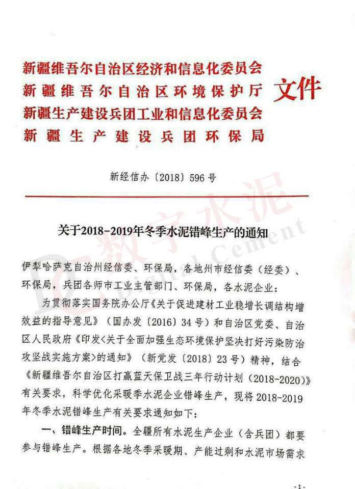 日前,新疆自治区经信委、环保厅、新疆生产建设兵团工信委、新疆生产建设兵团环保局联合发布《关于2018-2019年冬季水泥错峰生产的通知》(以下简称“通知”)。通知要求全疆各区域在去年错峰停窑的基础上再增加一至一个半月错峰停窑时间,并分两个时段执行。