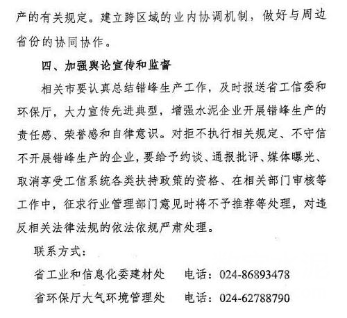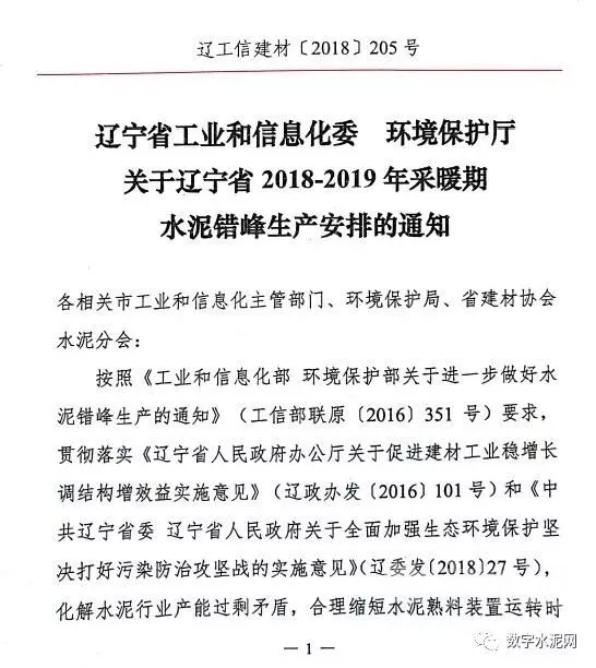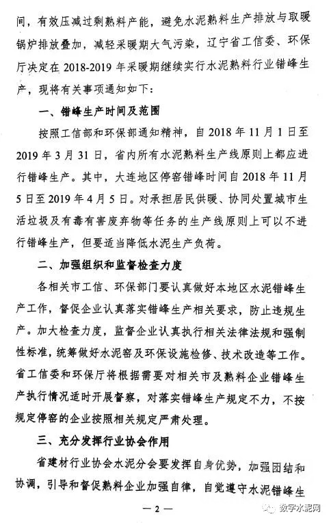 辽宁省工信委和辽宁环保厅下发了2018-2019年采暖期水泥错峰生产安排,通知要求,自2018年11月1日至2019年3月31日,省内水泥熟料生产原则上都进行错峰生产,大连地区时间为2018年11月5日至2019年4月5日,对承担居民供暖、协同处置城市生活垃圾及有毒有害废弃物任务的生产线可以不进行错峰,但要适当降低水泥生产负荷。